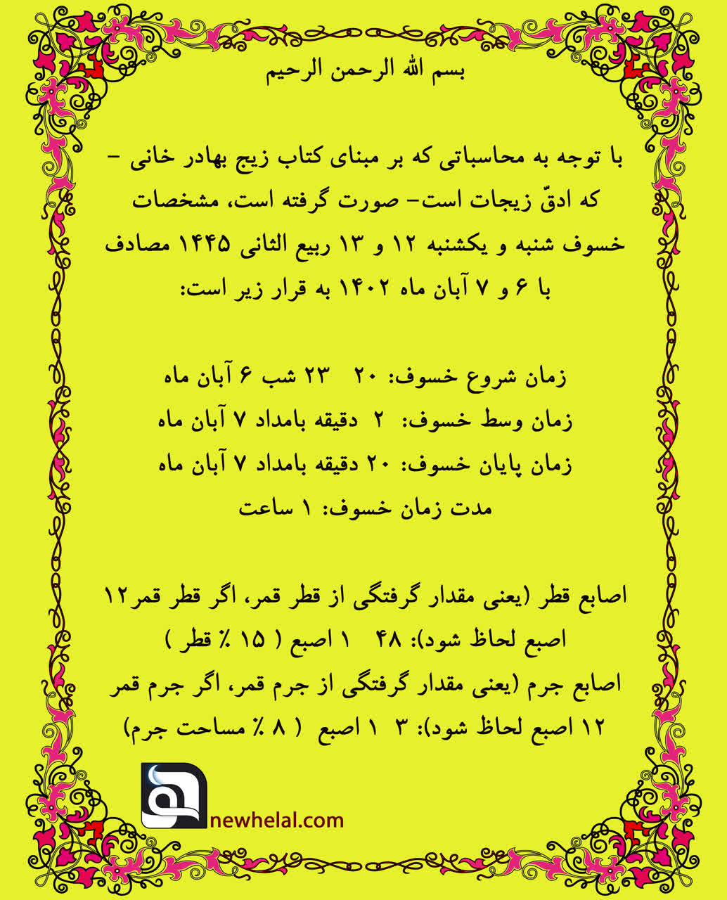 خسوف شنبه و یکشنبه، 12 و 13 ربیع الثانی 1445 مصادف با 6 و 7 آبان ماه 1402 ...
