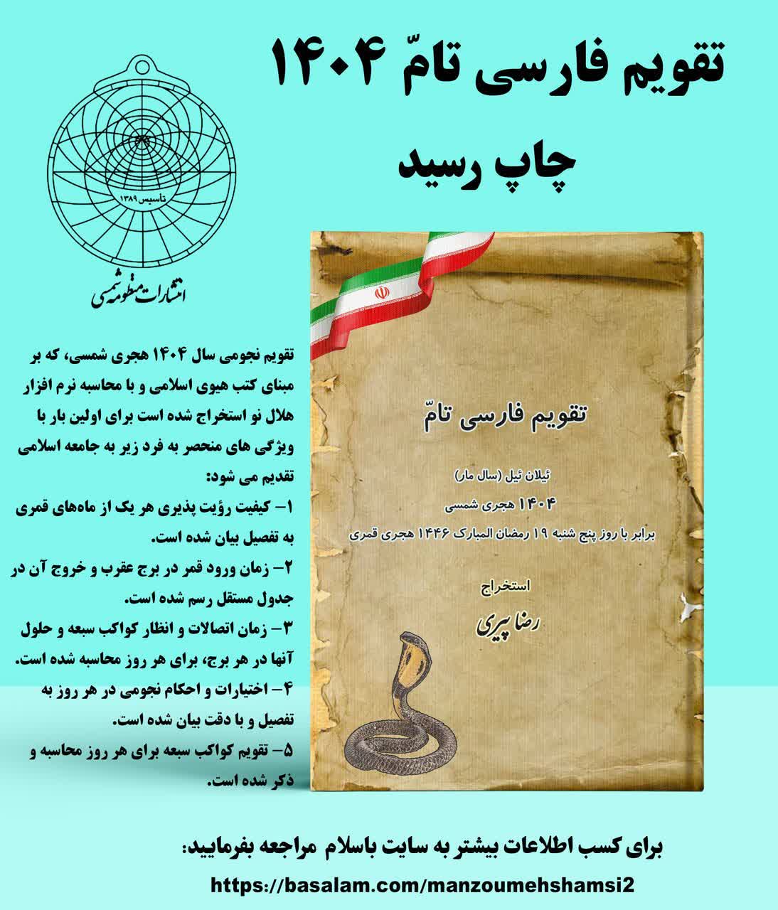 تقویم نجومی سال 1404 هجری شمسی، که بر مبنای کتب هیوی اسلامی و با محاسبه نرم افزار هلال نو استخراج شده است برای اولین بار با ویژگی های منحصر به فرد زیر به جامعه اسلامی تقدیم می شود ...