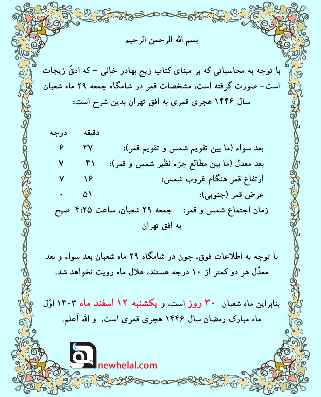 بنابراین ماه شعبان 30 روز است، و یکشنبه 12 اسفند ماه 1403 اوّل ماه مبارک رمضان سال 1446 هجری قمری است. ...