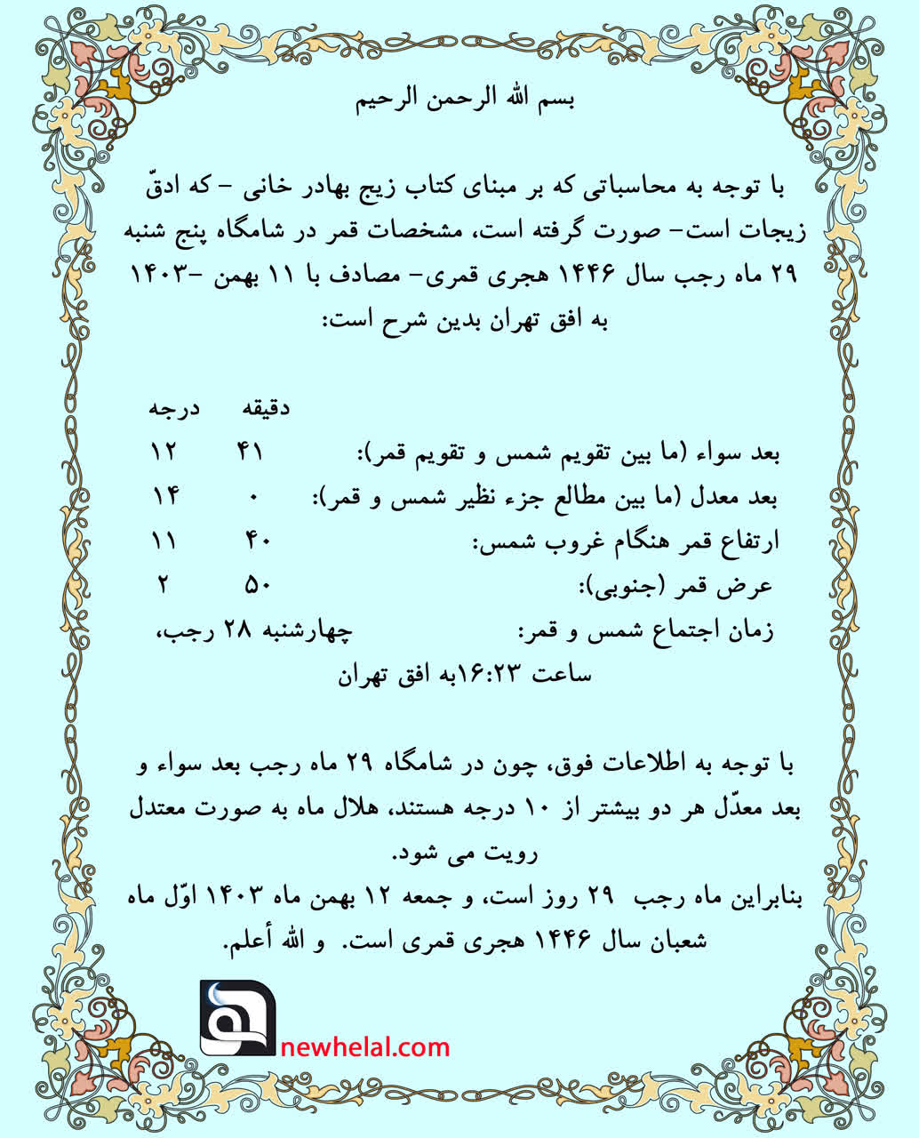 بنابراین ماه رجب 29 روز است، و جمعه 12 بهمن ماه 1403 اوّل ماه شعبان سال 1446 هجری قمری است. و الله أعلم. ...