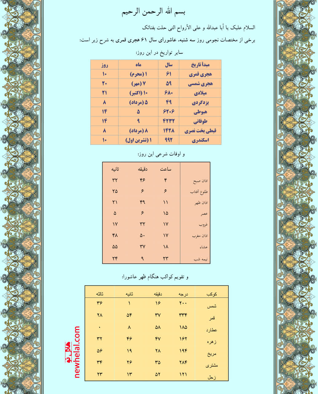 برخی از مختصات نجومی روز سه شنبه، عاشورای سال 61 هجری قمری و تقویم کواکب هنگام ظهر عاشورا و اوقات شرعی ظهر عاشورا ...