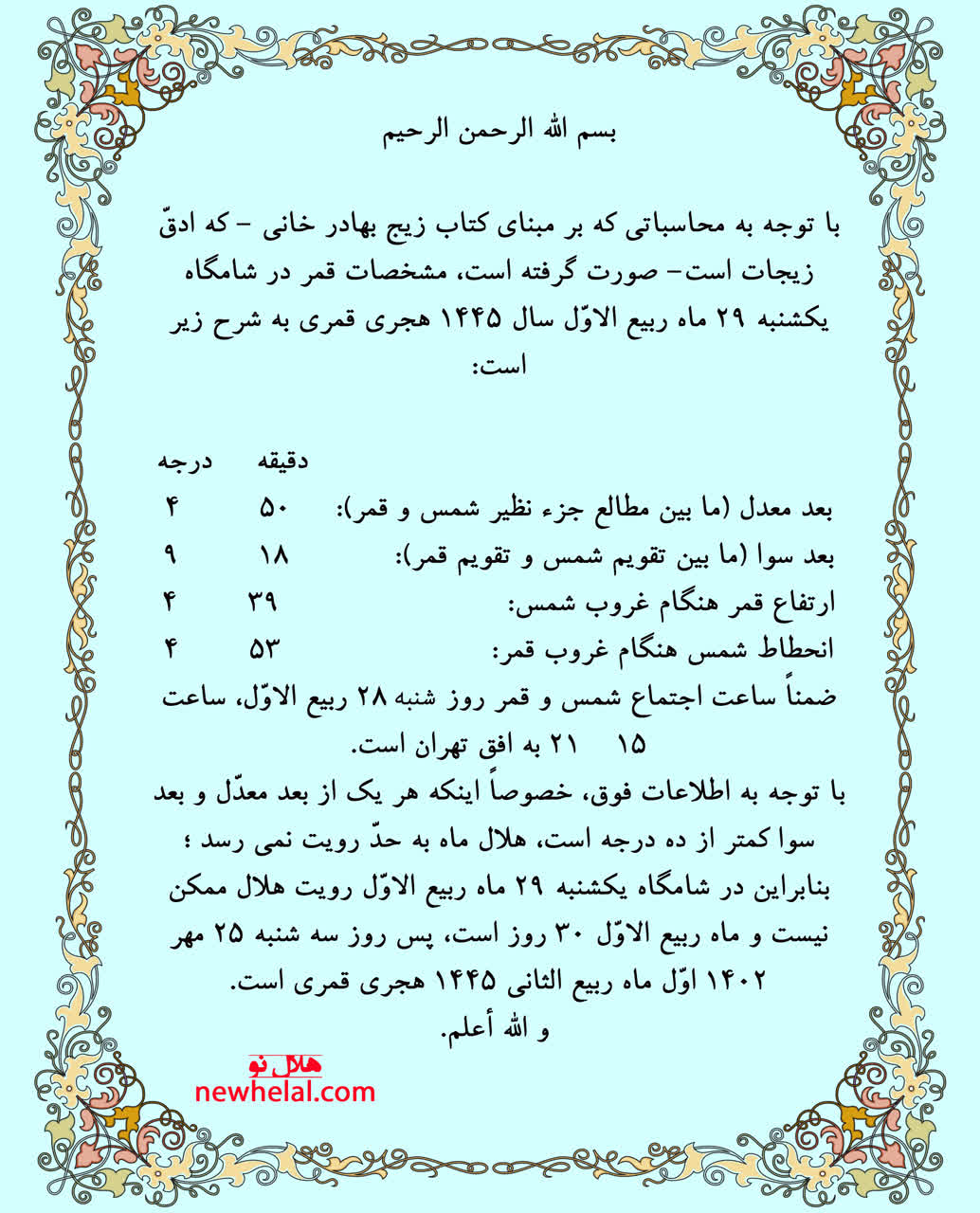 بنابراین در شامگاه یکشنبه 29 ماه ربیع الاوّل رویت هلال ممکن نیست و ماه ربیع الاوّل 30 روز است، پس روز سه شنبه 25 مهر 1402 اوّل ماه ربیع الثانی 1445 هجری قمری است. و الله أعلم.