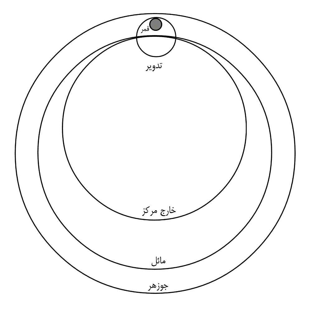 حرکت جرم قمر درون فلک خود مانند حرکت ماهی در آب نیست، بلکه جرم قمر مرکوز در تدویر است مانند دانه تسبیحی که نقره کوب شده باشد و تدویر در مائل حرکت می کند و مائل در ثخن ممثل.