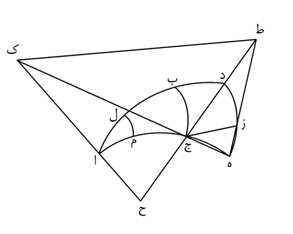 [4] "مثلث ا ب ج در سطح کره از دوائر عظام است، و هیچ یک از اضلاع آن بیشتر از ربع نیست، و زاویه ب قائمه است.
