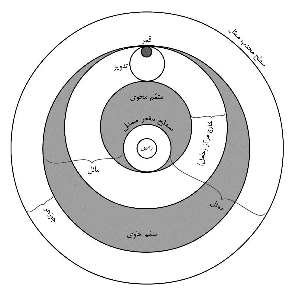 مرکز فلک ممثل قمر، مرکز عالم یعنی مرکز ارض است و وقتی این فلک به دور مرکز عالم به حرکت وضعی استداری حرکت می کند آنچه درون آن است از قبیل فلک جوزهر و مائل و تدویر و جرم قمر نیز به تبع او حرکت می کنند.