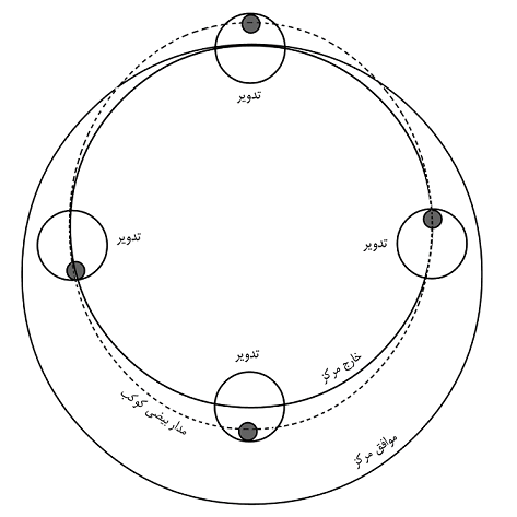 جواب: اگر چه قدماء حرکت افلاک را بیضوی نمی دانستند، لکن گاهی با ترکیب دو یا چند حرکت مستدیر، برای کوکب حرکت بیضوی یا اهلیلجی حاصل می شد. یعنی همان طور که امروزه مدار کوکب را به صورت یک شکل بیضی ترسیم می کنند و حرکت کواکب را ضبط می کنند، در گذشته همین مقصود با ترکیب چند حرکت مستدیر متشابه حاصل می شد؛ بدین شکل: