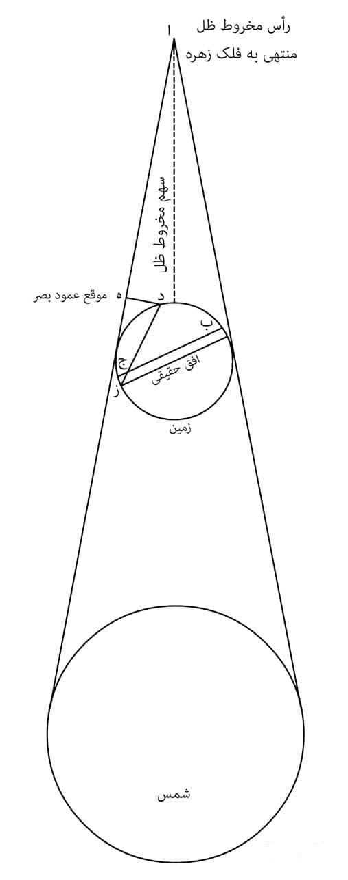 دال رائی و نقطه «ه» شعاعی است که قبل از رسیدن نور از افق به رائی به چشم رائی می رسد زیرا فاصله «د ه» از فاصله «د ح» نزدیک تر است به عبارت دیگر اولین نور و نزدیک ترین نوری که به چشم نزدیک است همین نور شعاع شمس از نقطه «ه» است. توجه دارید که شعاع شمس از دو طرف زمین تا نقطه الف یعنی ← رأس مخروط که کره زهره است به هم می رسند و داخل آن تاریکی شب قرار دارد. خط شعاعی چشم به وتر قائمه می باشد، زیرا کوتاهترین فاصله از چشم تا خط شعاعی شمس همین نقطه است مثلث «د ه ج»// قائمه و زاویه «ه» قائمه است و زاویه د ج ه حاده می باشد، و ب ج قطر دائره و دائره نیز قاعده مخروط ظلمت یعنی شب می باشد استدلال و شکل مزبور در معرفت وقت و قبله درس سی و هشتم آمده است.