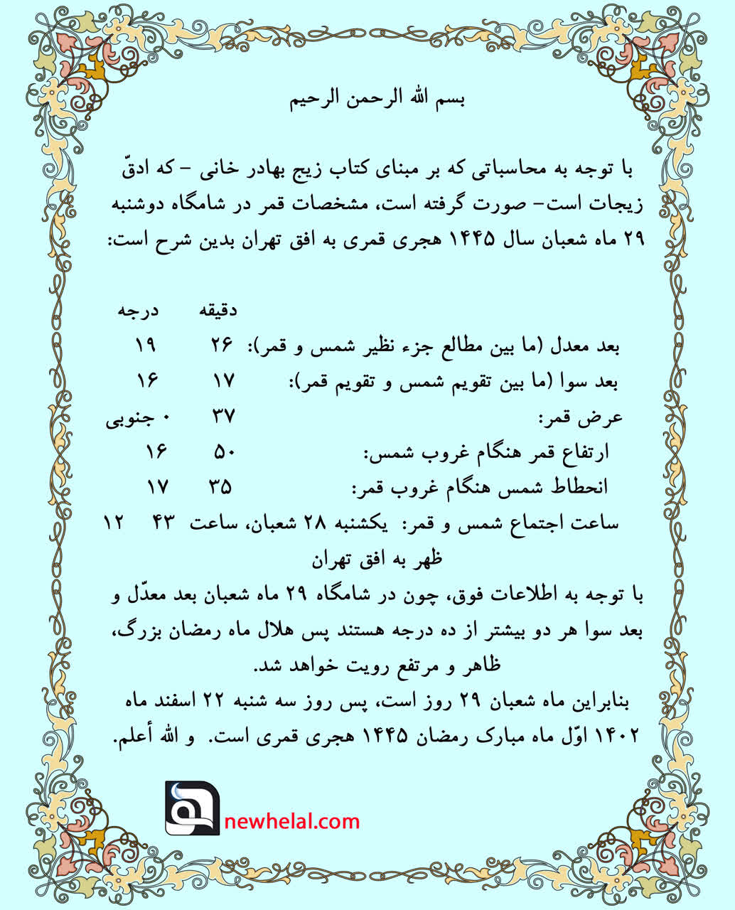 با توجه به محاسباتی که بر مبنای کتاب زیج بهادر خانی - که ادقّ زیجات است- صورت گرفته است، مشخصات قمر در شامگاه دوشنبه 29 ماه شعبان سال 1445 هجری قمری به افق تهران بدین شرح است:
