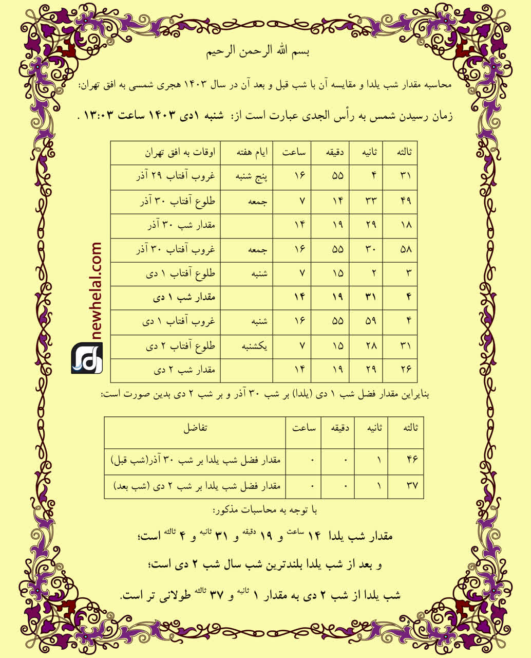 محاسبه مقدار شب یلدا و مقایسه آن با شب قبل و بعد آن در سال 1403 هجری شمسی به افق تهران: