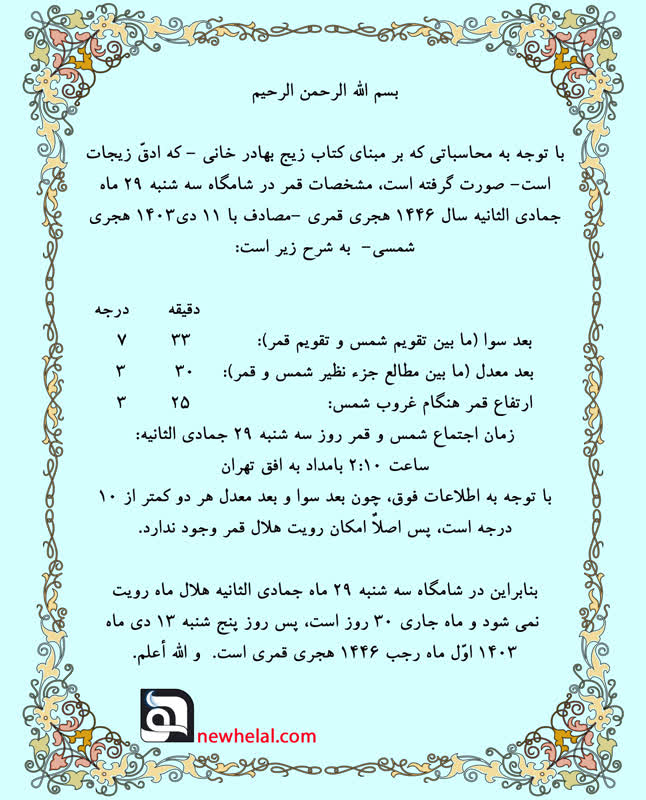 بنابراین در شامگاه سه شنبه 29 ماه جمادی الثانیه هلال ماه رویت نمی شود و ماه جاری 30 روز است، پس روز پنج شنبه 13 دی ماه 1403 اوّل ماه رجب 1446 هجری قمری است. و الله أعلم.