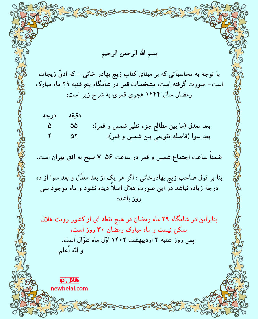 بنابراین در شامگاه 29 ماه رمضان در هیچ نقطه ای از کشور رویت هلال ممکن نیست و ماه مبارک رمضان 30 روز است، پس روز شنبه 2 اردیبهشت 1402 اوّل ماه شوّال است. و الله أعلم.